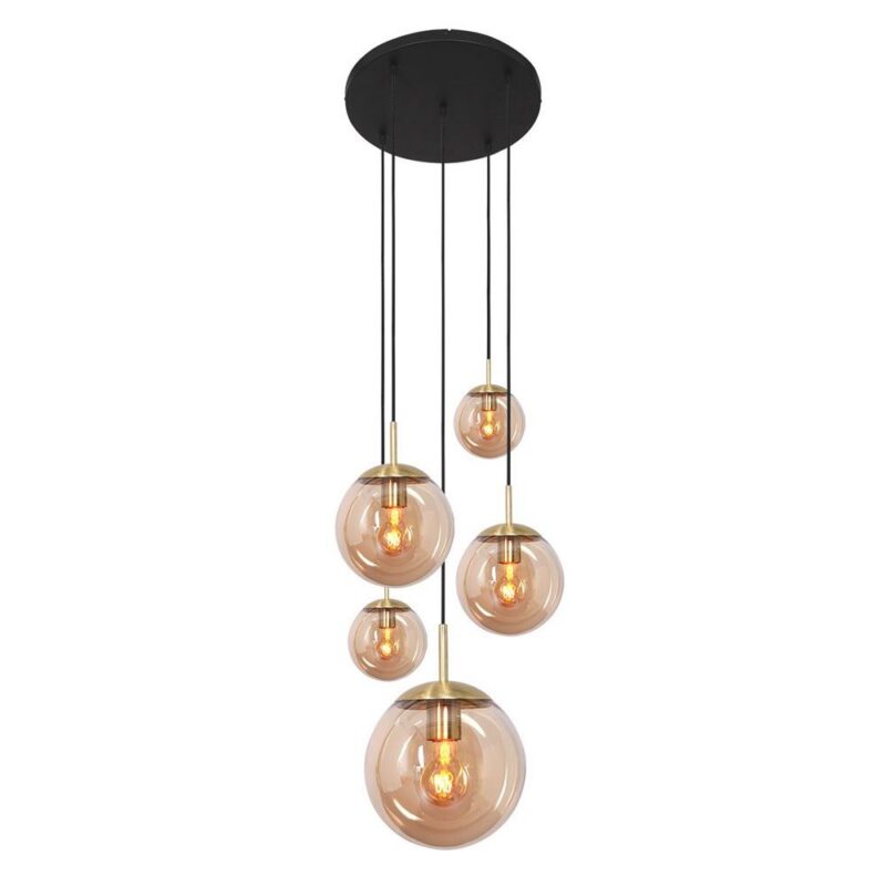 Die Pendelleuchte besteht aus Metall und ihre fünf unterschiedlich großen, kugelförmigen Lampenschirme bestehen aus edlem Glas.