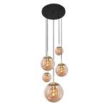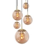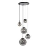 Die Pendelleuchte besteht aus Metall und ihre fünf unterschiedlich großen, kugelförmigen Lampenschirme bestehen aus edlem Glas.