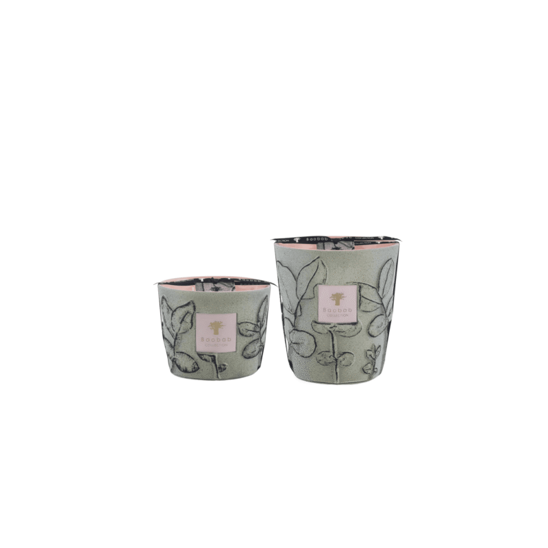 Die Materialien sind gegensätzlich und ergänzen sich bei diesem statuesken Duftgegenstand, der sich in einen einzigartigen und eleganten Dekorationsgegenstand für Sommerhäuser verwandelt. Die Außenseite der Keramik ist mit pflanzlichen Motiven wie Ästen und Blättern verziert, die an den Namen der Kerze erinnern. Der Name beschreibt eine mediterrane Pflanzenwelt, die aus Sträuchern besteht.
